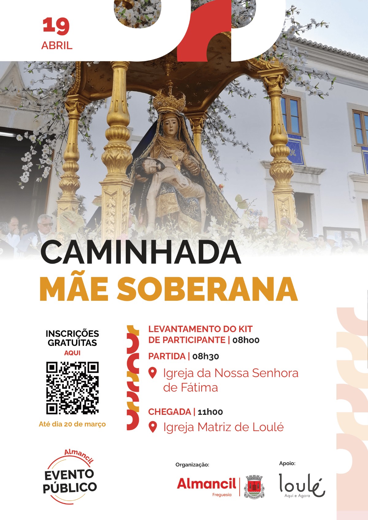 Ver detalhesNo dia 19 de abril, a manhã será dedicada à prática desportiva e à valorização do património do nosso concelho, ligando Almancil a Loulé.O levantamento do kit de participante será feito às 08h00, em frente à Igreja de Nossa Senhora de Fátima, em Almancil. O início da caminhada está previsto para as 08h30, contando chegar à Igreja Matriz de Loulé pelas 11h00.Já fez a sua inscrição? O formulário de inscrição está disponível até dia 30 de março no seguinte link:https://forms.gle/txybE8AEK2ajoP1X8