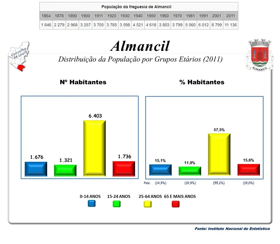 A freguesia de Almancil tem 62,2995 km2 e 10.677 habitantes (dados dos Censos 2011 do INE corrigidos pela alteração territorial de 2013).